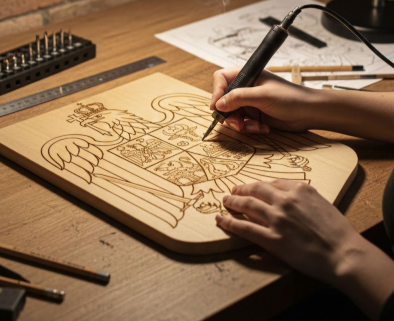 Dăm formă emoțiilor prin gravură manuală pe lemn, realizată cu rigoare și pasiune — de la portrete și simboluri ancestrale, până la blazoane, obiecte de decor și cadouri unicat.